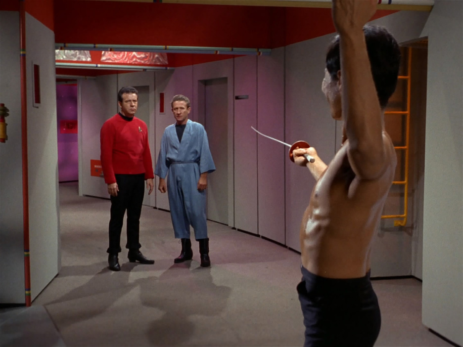 Unfortunately (for me at least) the only nudity on offer is Sulu, who strips to the waist and starts fencing random folk. As in attacking them with a sword, not building a fence around them.